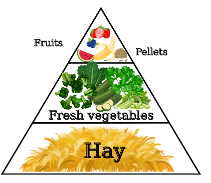 So, hay, as the main part of their diet, should account for 80-90% of what a rabbit eats. The best approach is to offer it unlimited, 24 hours a day. Rabbits should eat at least a bundle of hay roughly the size of their own body daily.